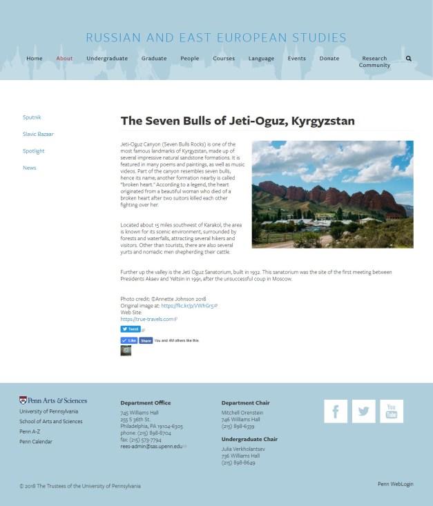 This article from the series of “Spotlights” for the department of Russian and East European Studies at The University of Pennsylvania shows us the beautiful and stunning colour and shape of the Jeti-Oguz Canyon known as the; Seven Bulls Rocks.