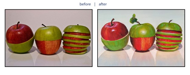 Today’s stunning piece of work titled “”Comparing Apples”, comes from Ros Beck who is an artist in Christchurch, New Zealand. Her images are predominantly Horses and dogs, but here she shows her talent to diversify into other subjects with this piece.